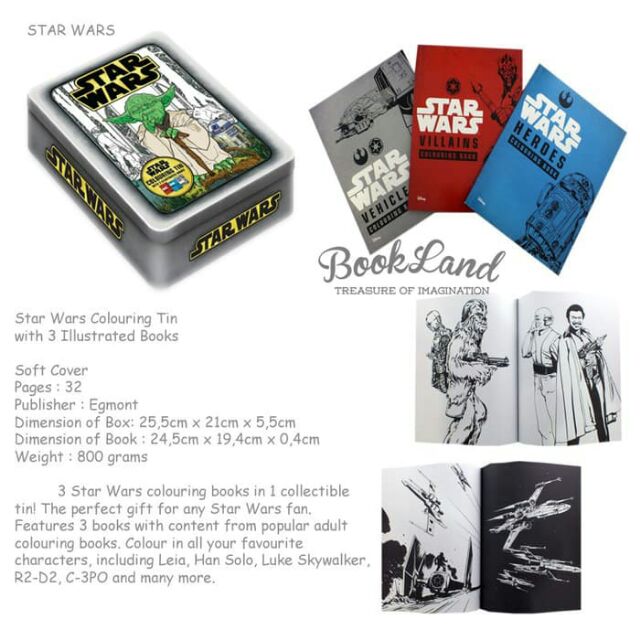 The Star Wars Colouring Tin is not to be confused with the tins of colouringstories and stickers that are often found in supermarkets and are aimed at the age of 3 upwards. The books have the themes Heros Villains and Vehicles. The jumbo coloring book is brand new.